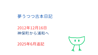 2012② / 2025追記 【2012年12月26日/2025年8月追記】歳末古書市から中野、高円寺、荻窪 【2012年12月26日】新宿京王百貨店、歳末古書市。9時50分、百人ほどの列に加わり、係員が配ってくれた会場案内図を眺めて、おおよその旅程・・を立てる。エレベーターに乗り込むと、エレベーターガールは淑やかに忠実に――「7階、文具、玩具、催... 2025.08.09 2012② / 2025追記